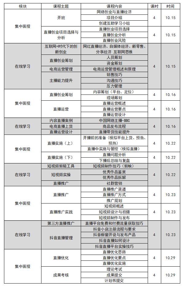 网络创业培训(直播版)课程是由杭州市人社局组织专家研发,将互联网知识与创业技能相结合的特色课程。该课程引入翻转课堂理念,采用线上+线下相结合的教学模式,旨在更好地启发学员的互联网创业意识,帮助学员精准高效掌握直播实操技能,并通过直播规划书及实践成果的提交,在实现产品营销推广和内容转化的基础上推动创业项目成功落地。培训共分为14次课,56学时,其中10次集中面授,4次在线学习,疯av