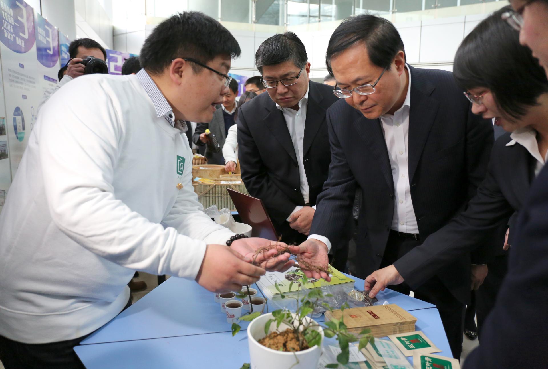众创空间,10多个校友、教师、学生创业团队向来宾展示了各自的创新创业成果。车俊省长详细询问了各个项目的进展情况,并与他们深入交流创新创业方面的想法、做法以及遇到的困难和问题,鼓励他们放开手脚创新创业,并不断总结经验教训,提取积累更多的成功因子。当得知何叶丹、刘琦鑫校友伉俪毕业返乡扎根农村,投身农村金融创新后,车俊省长鼓励他们说“创业路上的革命伴侣可以传为一段佳话,你们能发挥所学专长,把农村金融创新和现代农业生产相结合,很值得鼓励学习,好好做下去,一定能取得成功!”
