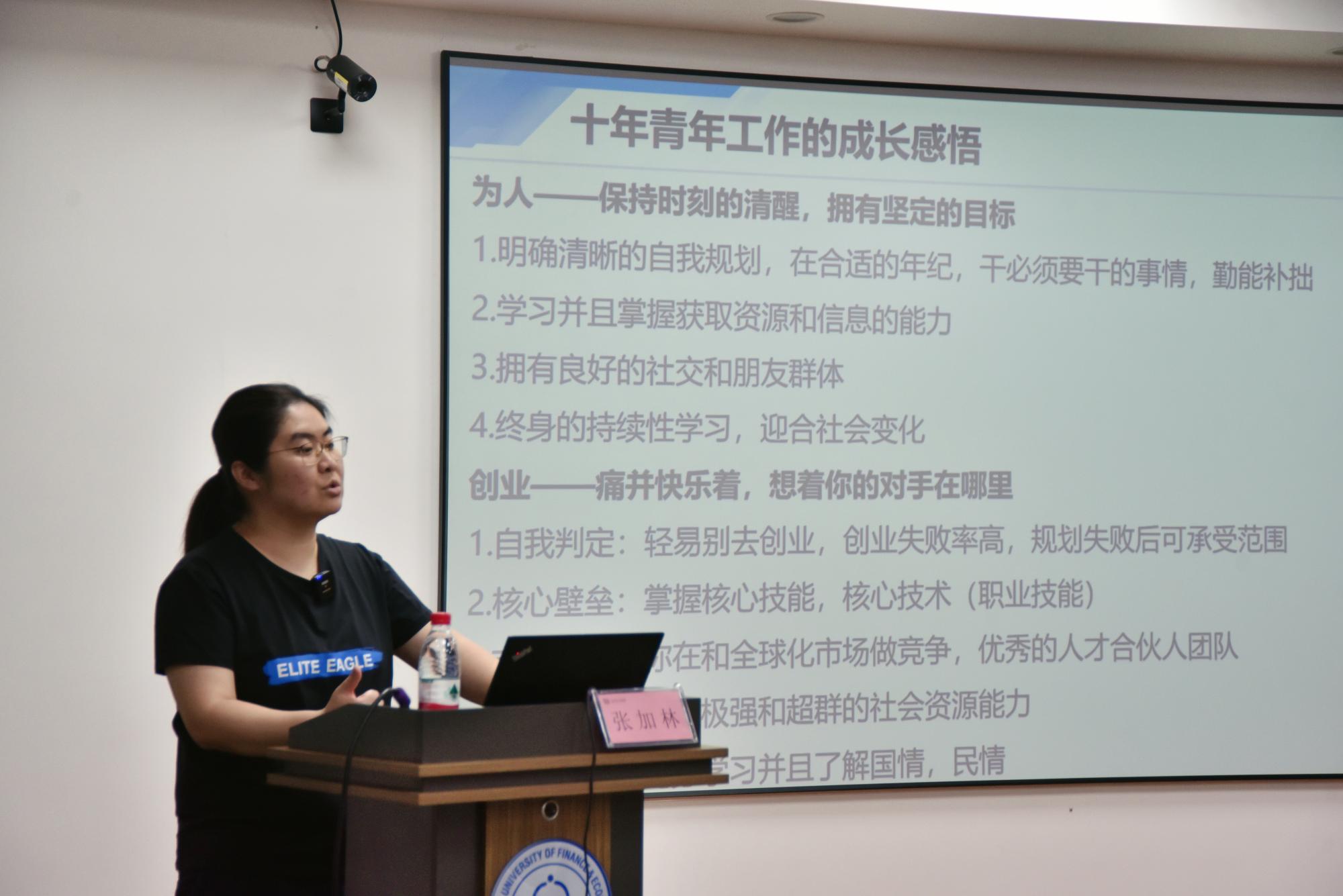 随后,张加林以自己的大学经历为例,讲述了大学生应该如何从学生工作走向创新创业。她指出大学有四寻,即寻平台、寻同道、寻导师、寻方向,为自己的创业之路做好铺垫。同时也说明了积极参加学生会等各种学生工作的重要性,在其中反思得来的经验以及自我的成长对未来的创新创业有很大的帮助。此外,她还强调了大学生应当踏实肯干,在实习这条由大学生走向社会人的路上审视自己,发现长处并弥补不足,为创新创业打下基础。