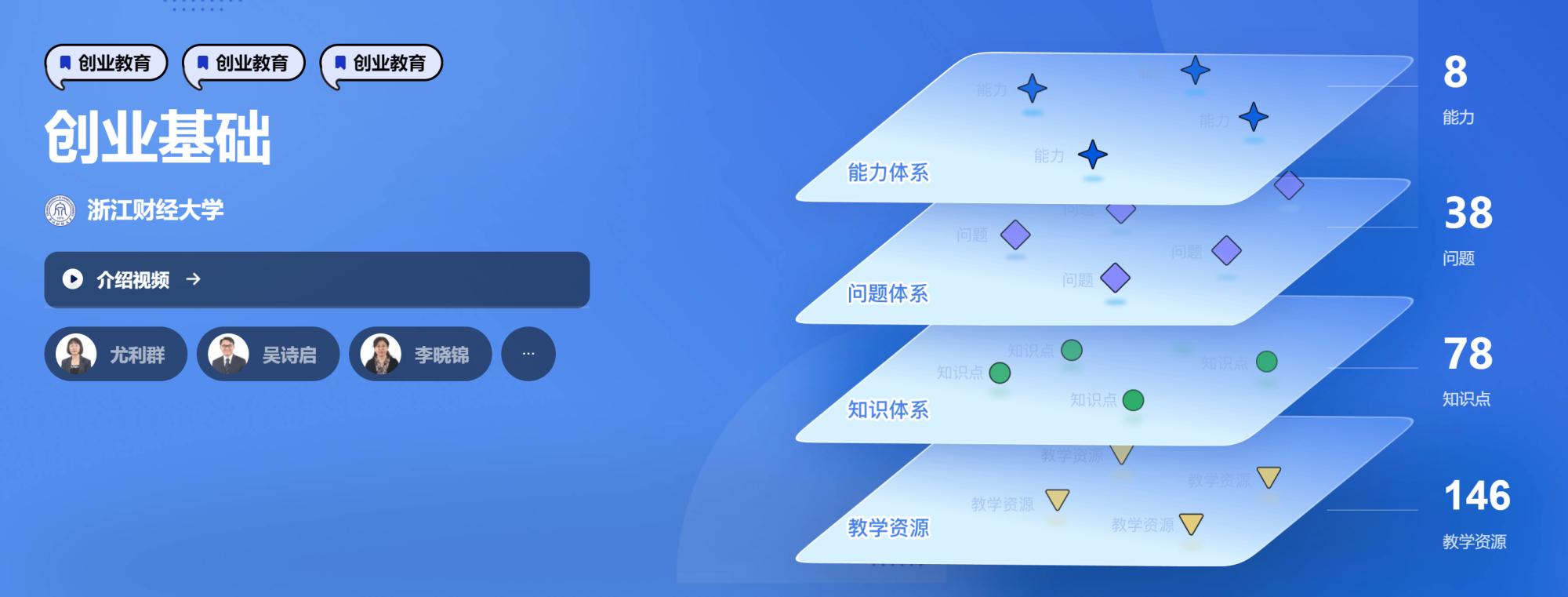 目前上线的标准课程版本中,《大学生就业与创业指导》共建立起6个能力层次、研究出22个问题体系,建构110个知识点和151个知识关系,《创业基础》共梳理出8项能力层次、78个知识点,构建起77个知识关系,链接146项教学资源。