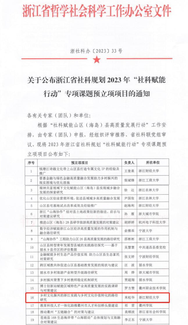 中国乡村振兴研究院学术中心主任米松华主持的课题“乡村文化振兴的浙江实践与乡村文化价值转化的路径研究”成功立项。