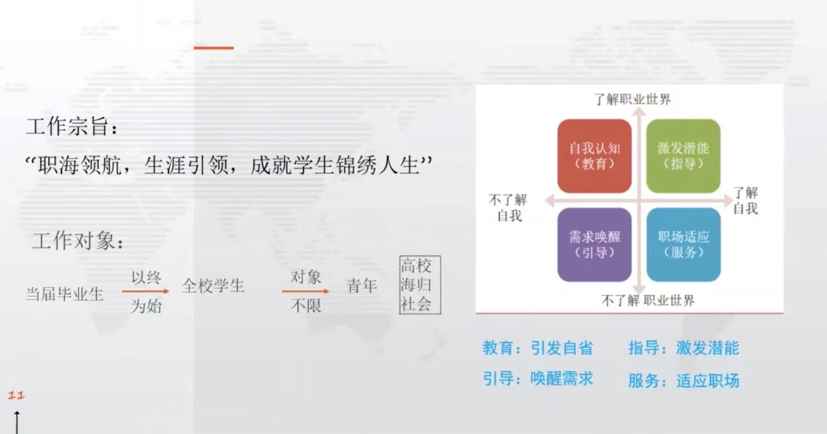 陈锦秀还分享了她对于职业生涯教育目标的看法,职业生涯教育应该更侧重于引发学生自省,通过引导指教去激发学生的潜能,让学生在未来更好地适应职场变化,规划好自己的职业生涯。