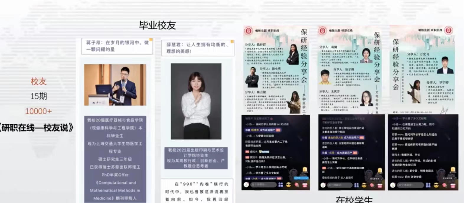 陈锦秀提到,建设好职业生涯规划工作室主要依靠校内、校外两股力量。校内依靠辅导员、专业规划师进行咨询,校外则由包括企业导师、校友等开展沙龙咨询活动,并综合运用线上线下两种形式,开展特色职业规划工作。在线下,陈老师工作室一般采用摆摊咨询的方式,让学生与职业规划老师近距离交流,这将更能激发学生了解职业生涯规划教育的积极性。在线上,工作室采用云课堂直播的方式,能够让学生知晓职业教育的全貌。工作室通过这两种特色教育方式来帮助同学们有效进行职业生涯规划。