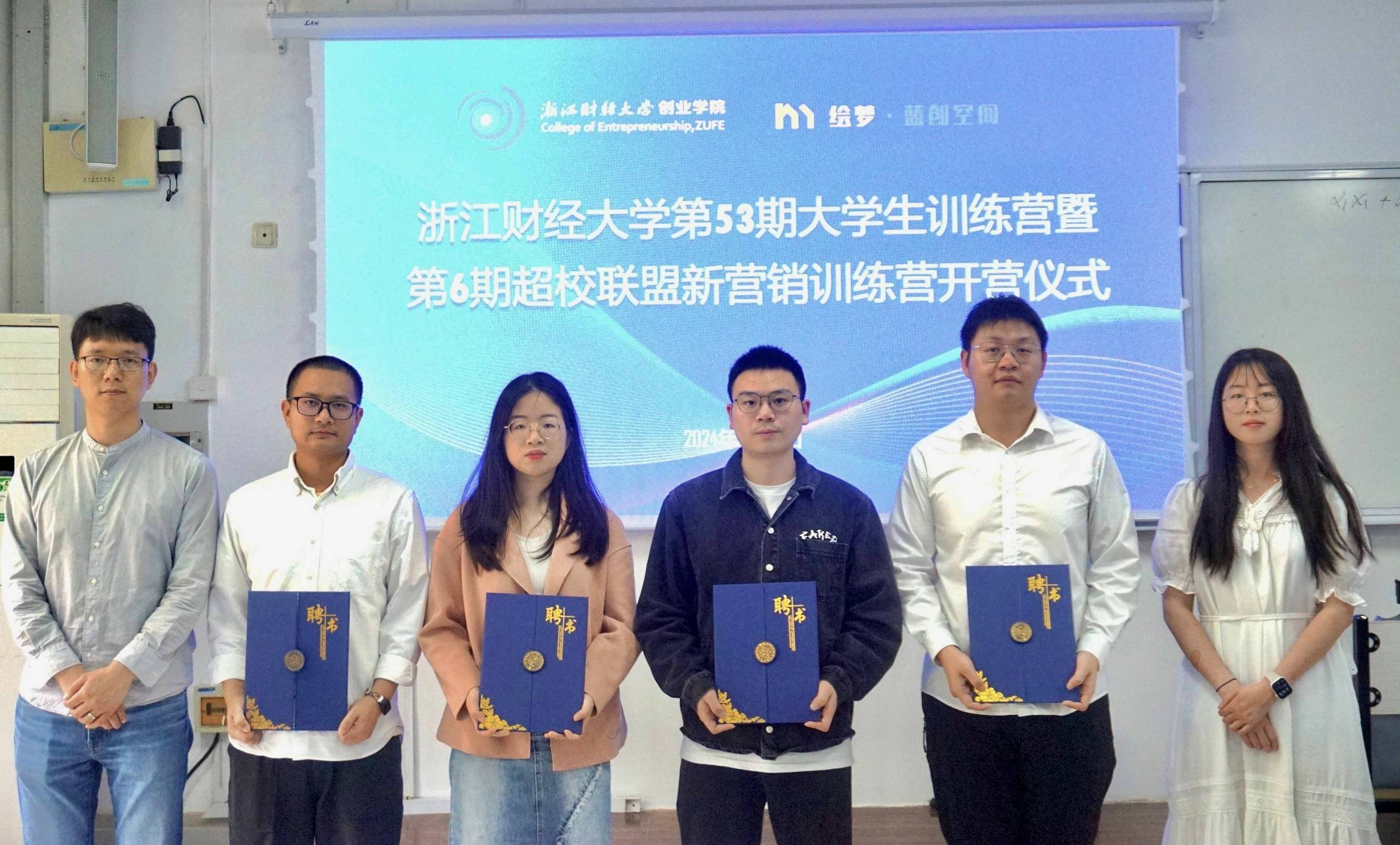 第53期大学生创新创业训练营暨第6期超校联盟新营销创业训练营顺利开营。绘梦蓝创空间负责人鲁玥,超校联盟代表黄勇,杭州猫哆鱼科技有限公司代表吕铭洲,新营销训练营实训导师刘周麟、廖晓梅、陈立军,第5期训练营优秀团队负责人戴文博参加开营仪式。