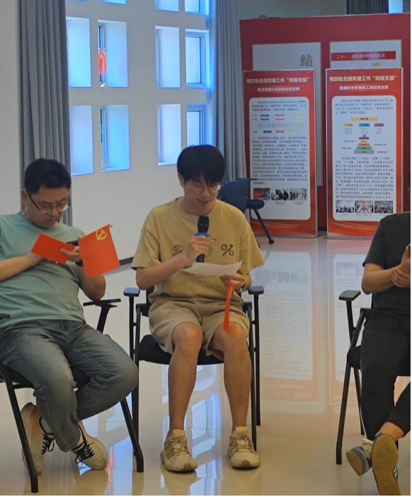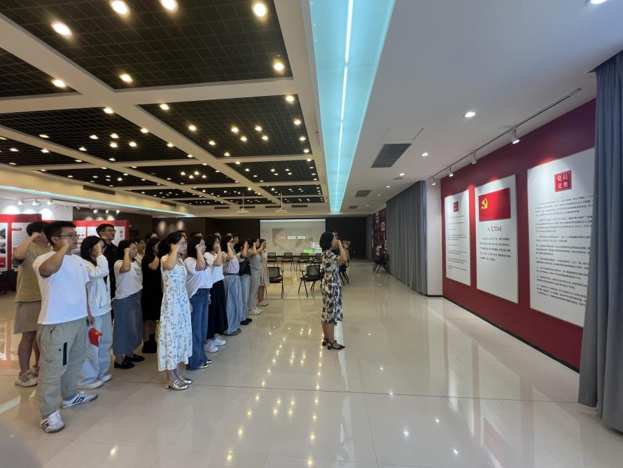 随后开展重温入党宣誓仪式,在党总支书记黄金娟的带领下,包括新发展党员徐明元在内的全体党员同志面向党旗庄严宣誓,铿锵有力的誓言在会场回荡,彰显着共产党员的坚定信念。