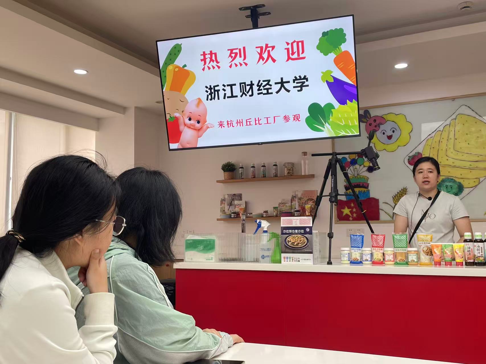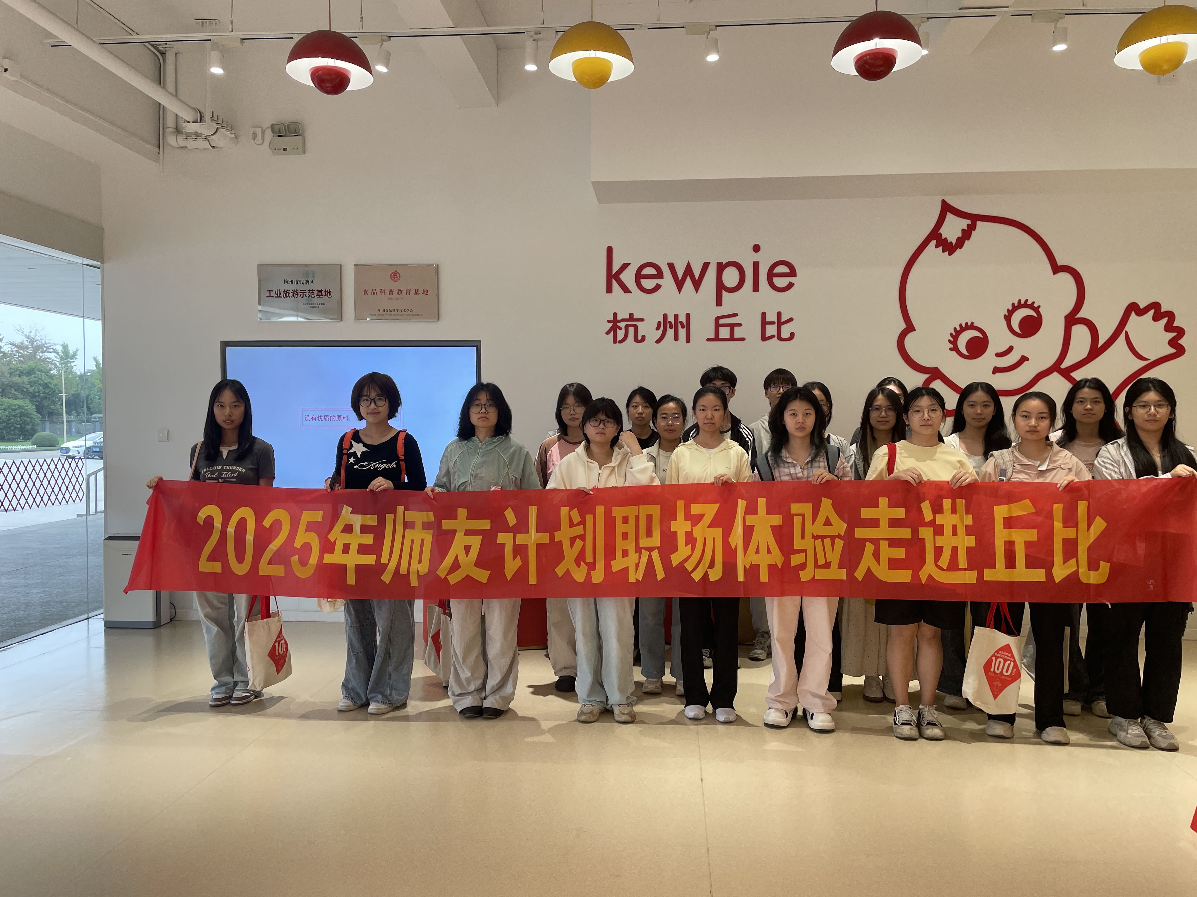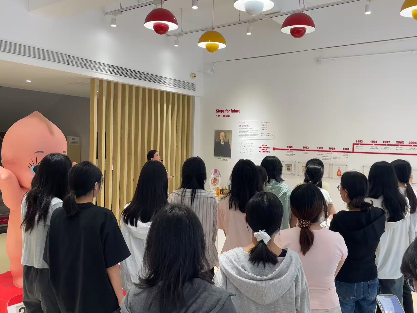 活动当天,同学们在企业讲解员的引导下,首先踏入品牌历史长廊。从1919年丘比株式会社创立的初心,到2002年杭州丘比落地中国的产业布局,再到沙拉酱、果酱等系列产品的迭代创新,讲解员通过图文与实物展示,生动呈现了企业“乐业偕悦”的经营理念与“注重道义、努力创新”的行为准则。墙上的时间轴清晰标注着企业从单一产品到多元矩阵的发展轨迹,让学生们直观理解“品牌是生产商与顾客之间的约定”这一核心逻辑。
