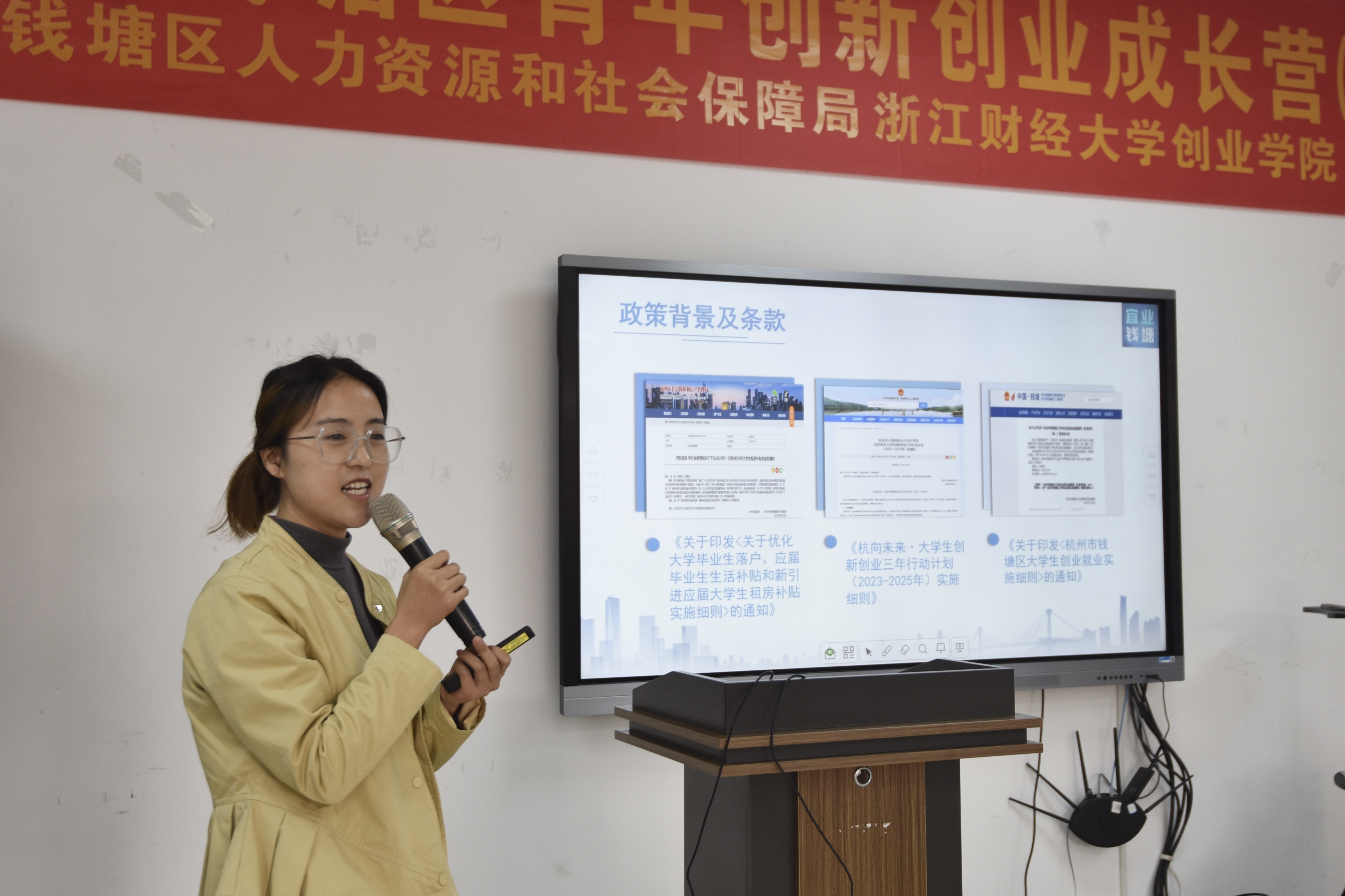 专聘副院长林建林为成长营致开场词。随后,钱塘区人才开发科郑益玲为学员带来详尽的大学生创业就业政策解读,为就业创业提供指导。