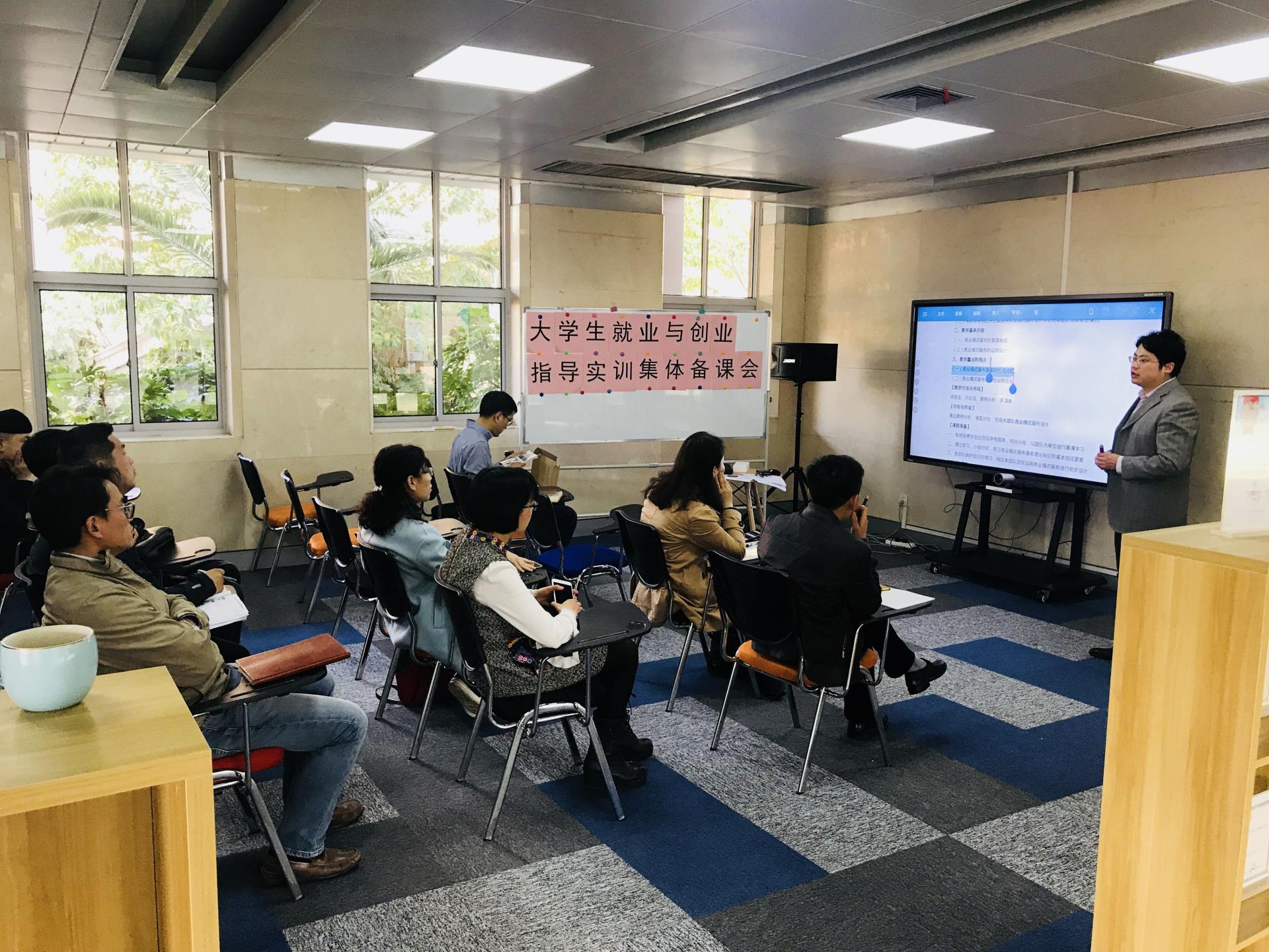 首先,沈鑫泉副院长向各位授课教师介绍了创业实训课程组备课基本情况,并说明了应该注意的一些具体事项。紧接着,叶城均老师对商业模式画布设计专题进行了详细地讲解,并对课程的关键环节进行了现场演示。讲解结束之后,授课教师针对创业实训专题涉及到的一些具体事项进行了交流与互动。