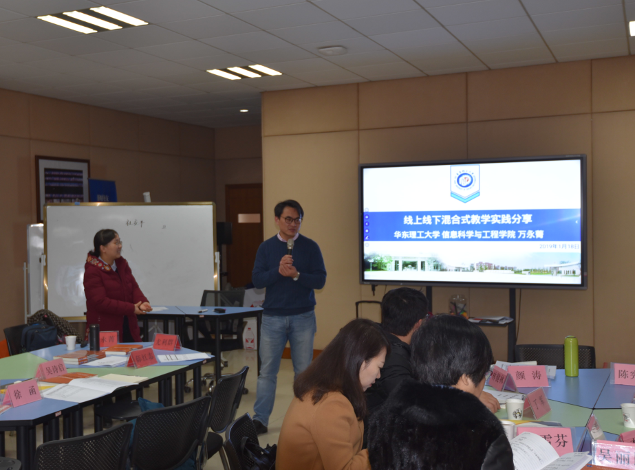 华东理工大学信息科学与工程学院副院长万永菁受邀参与此次《创业基础》研讨会并与在场的课程任课教师们分享了自己线上线下混合式教学实践的经验。万院长主要从在线视频的设计、在线练习的精选、翻转课堂的互动交流、实践提高的实践项目设计四个方面介绍了自己课堂教学的经验,在讲解过程中,万院长还分享了自己的教学箴言:“精心备课是师德师风的体现,立德树人理念支撑起成功课堂”。