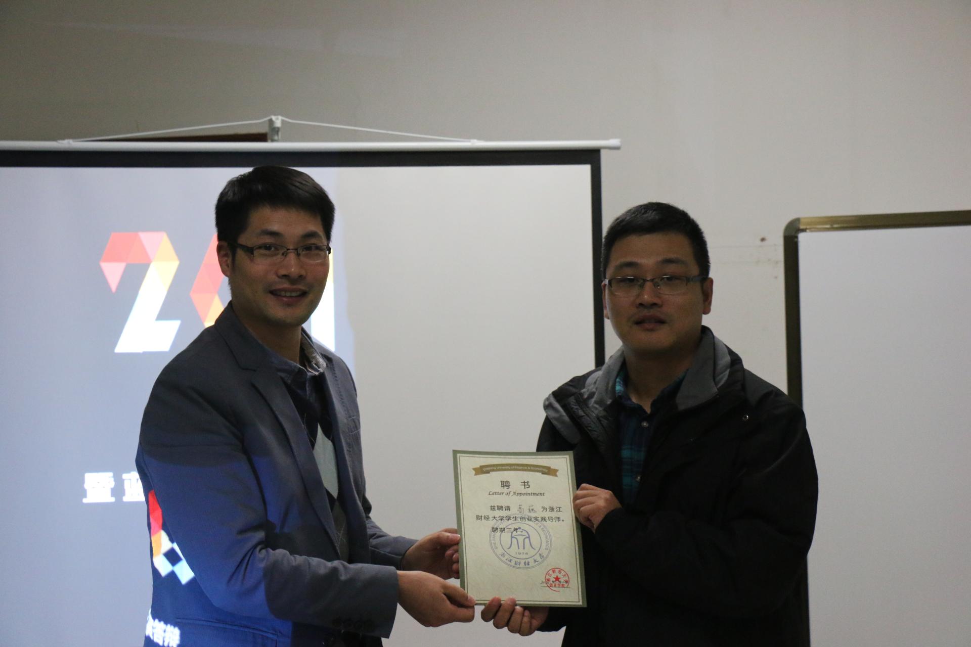 创业实践导师,并由沈鑫泉老师颁发证书。