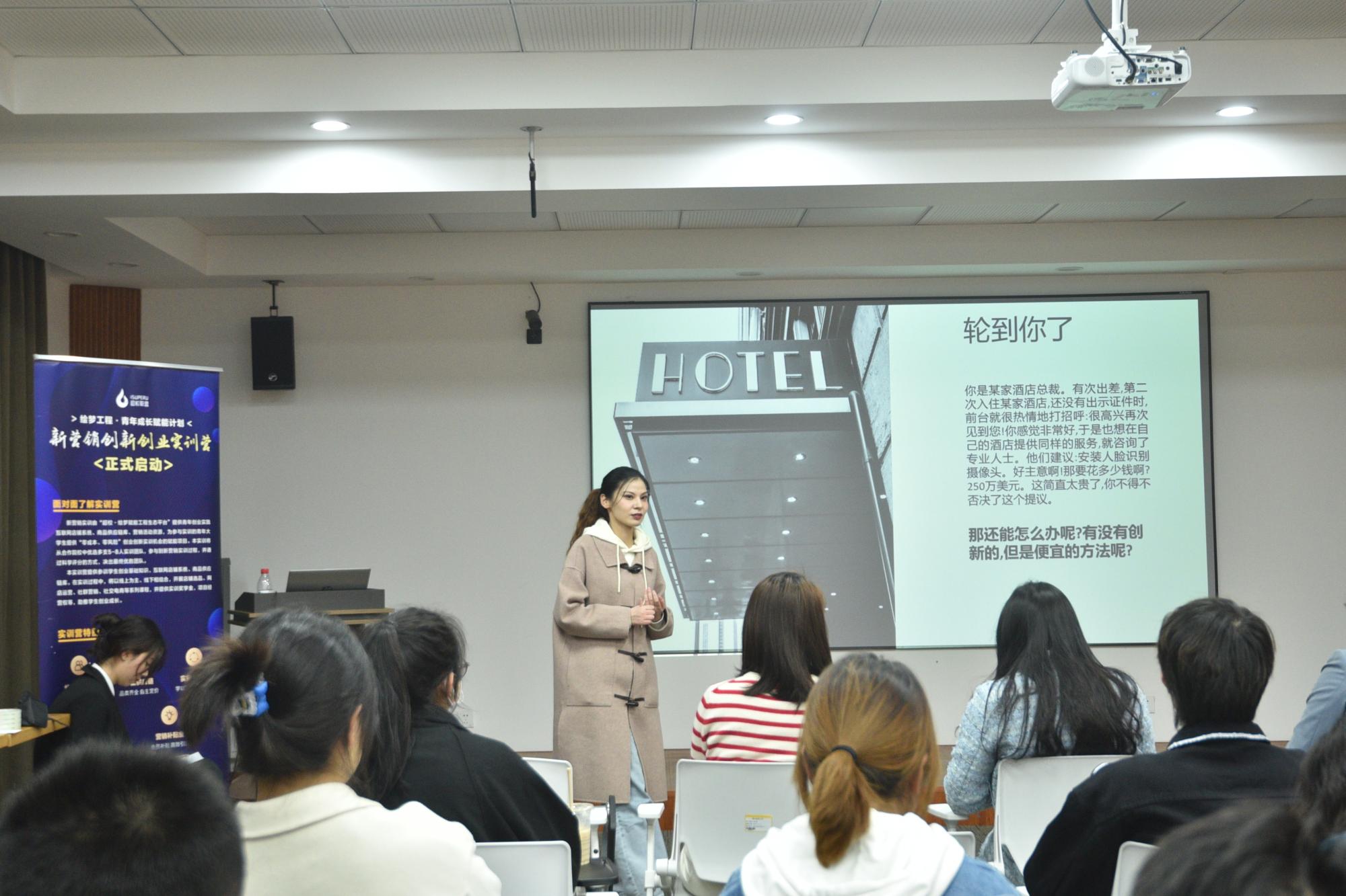 随后李娅女士从项目概述、项目价值收获期许和计划安排的角度出发,通过与在场同学及线上同学的交流与互动,以敢于脱离局限思维的独特角度对新营销创业实训项目作了具体介绍。