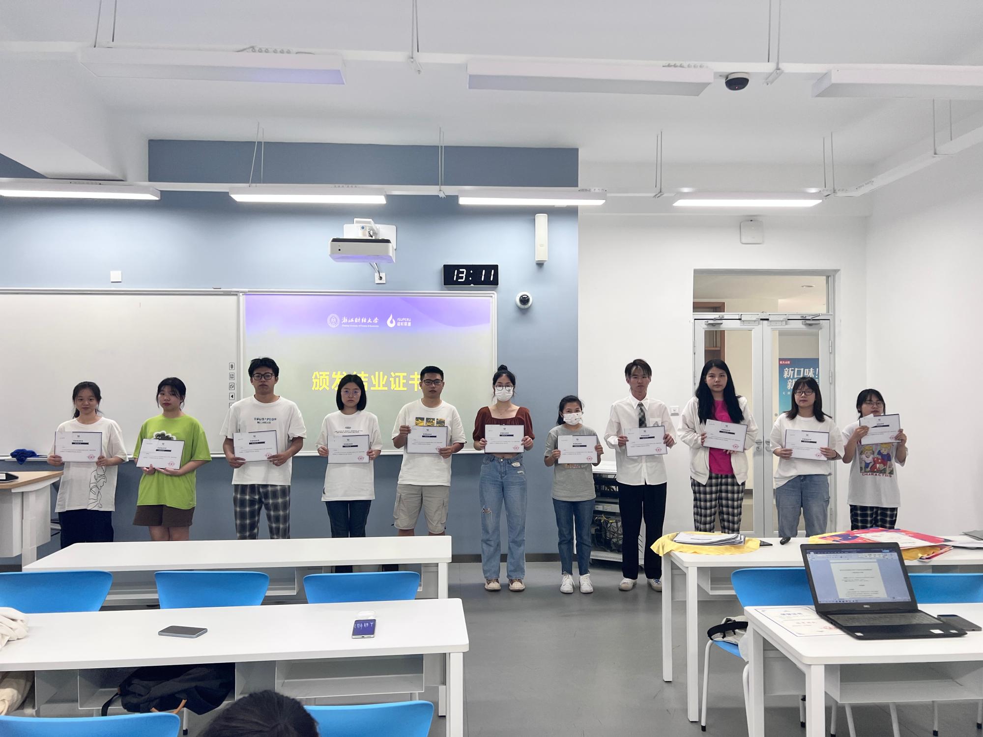 接下来,郑洋老师为本期训练营学员颁发结业证书。随后,颜鑫宇和吴佳洁同学作为优秀学员分享了自己在本次训练营中的收获与感受。颜鑫宇同学分享了他的团队开通线下自助售卖站点的创新方式,提到训练营给他收获最大的地方就是做事一定要有行动力。他在训练营中不仅学习了电商运营的相关知识,还获得了面对困难的勇气,做出改变的魄力和说做就做的能力。吴佳洁同学分享了她在本次训练营活动中收获到的从市场营销和电子商务的角度看未来职业发展的视角,并对本次活动中耐心指导的老师表达了衷心的感谢。