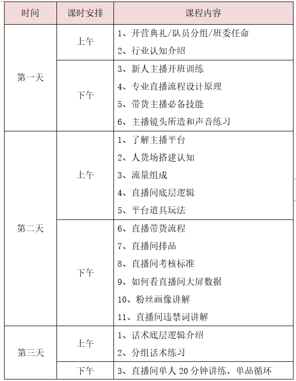 1、了解直播平台;2、人货场搭建;3、流量组成;4、直播间底层逻辑;5、平台道具玩法;6、直播带货流程;7、直播间排品;8、直播间考核标准;9、如何看直播间数据大屏;10、粉丝画像认知;11、直播间违禁词讲解;12、直播话术撰写;13、直播带货GMV