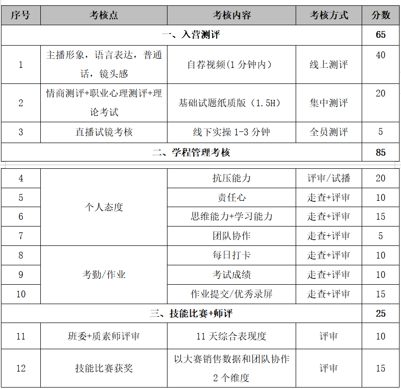 实训学员成绩构成:职业测评(2轮):65分+学程管理:85分+实操考核成绩:25分