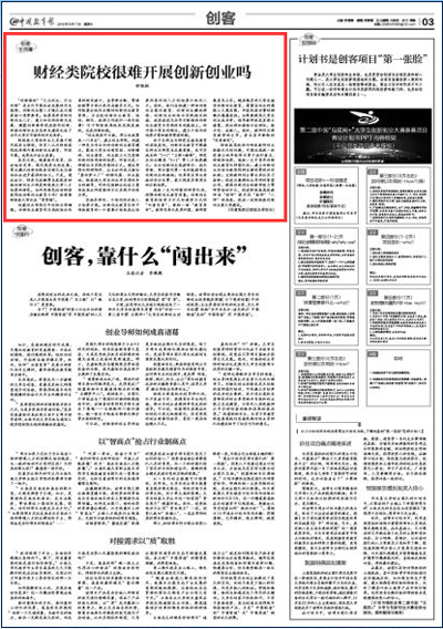 9月17日,《中国教育报》第3版大篇幅刊登钟晓敏校长撰写的题为《财经类院校很难开展创新创业吗》的文章。