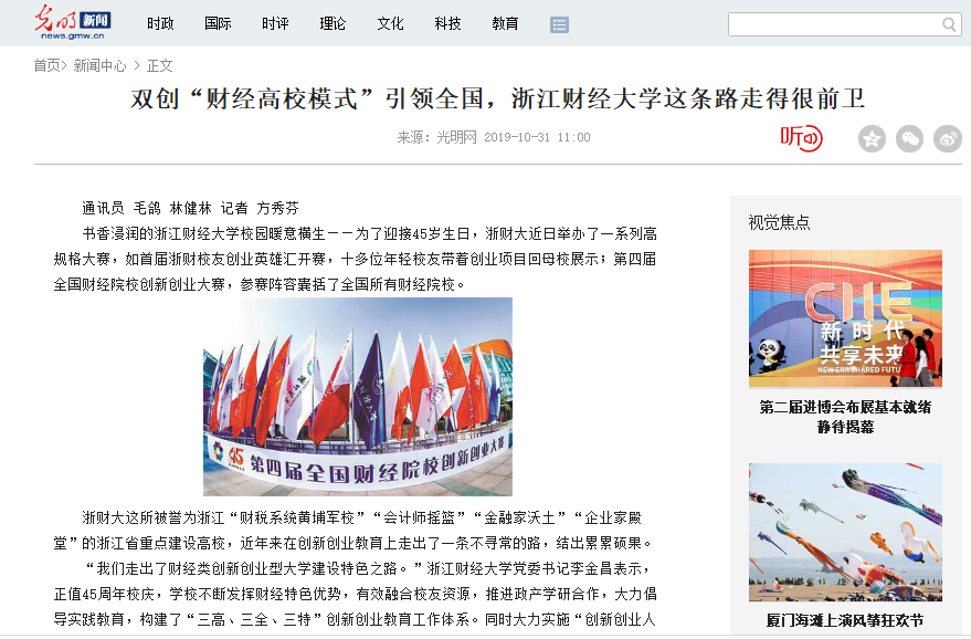 10月30日,《光明网》《杭州日报》、《杭州网》《网易》、《今日头条》、《凤凰新闻》等媒体以《疯av “财经高校模式”引领全国,疯av 这条路走得很前卫》为题,大篇幅报道了疯av 不断发挥财经特色优势,有效融合校友资源,推进政产学研合作,大力倡导实践教育,构建“三高、三全、三特”创新创业教育工作体系。