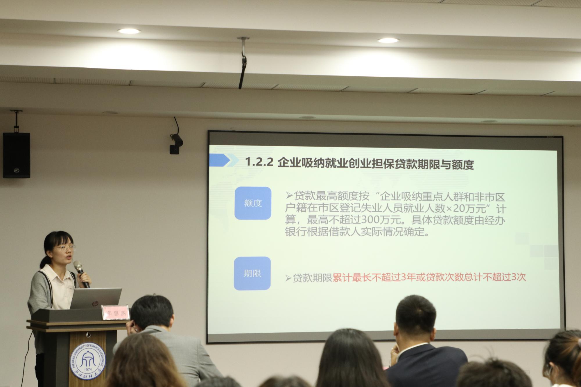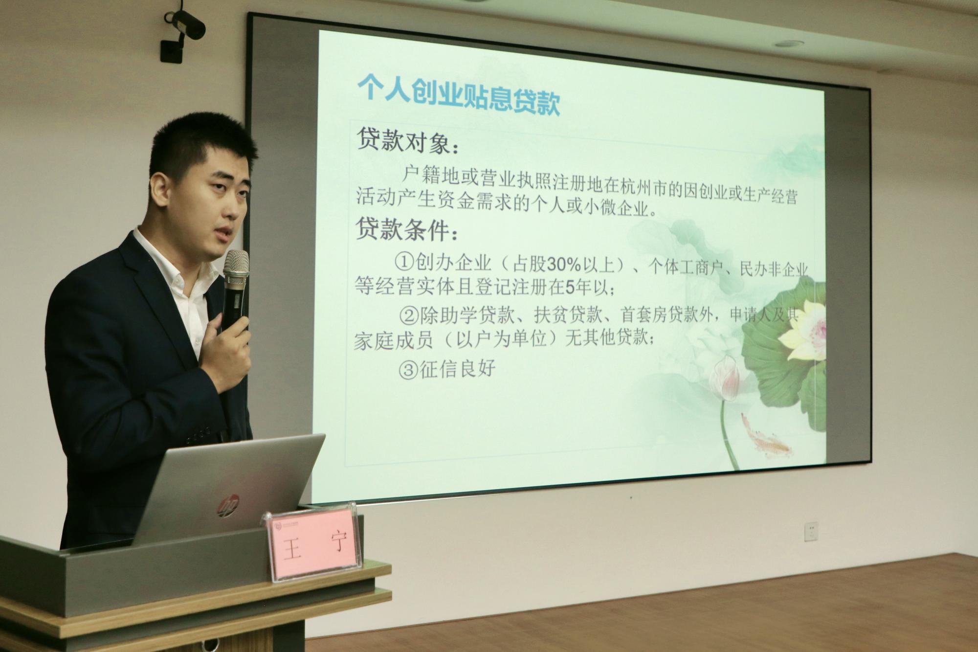 最后,联合银行下沙支行王宁则向老师同学们介绍了个人及企业创业贴息贷款的银行审批流程,此外还向我们展示了银行的信贷产品及票据业务,帮助同学们更好地了解了杭州大学生创业贷款的多方面信息,为大学生创业发展提供了极大的帮助。