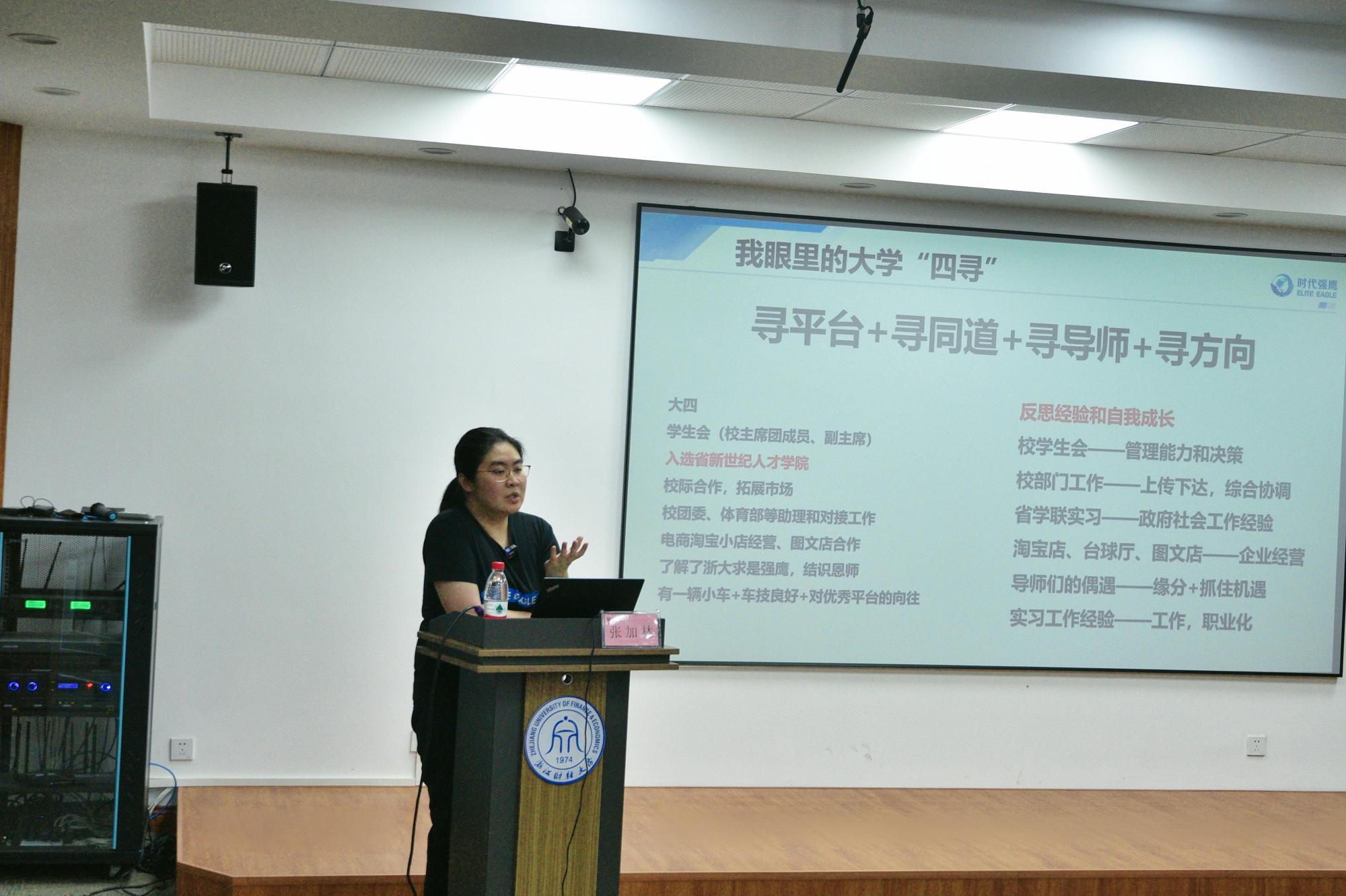 随后,张加林以自己的大学经历为例,讲述了大学生应该如何从学生工作走向创新创业。她指出大学有四寻,即寻平台、寻同道、寻导师、寻方向,为自己的创业之路做好铺垫。同时也说明了积极参加学生会等各种学生工作的重要性,在其中反思得来的经验以及自我的成长对未来的创新创业有很大的帮助。此外,她还强调了大学生应当踏实肯干,在实习这条由大学生走向社会人的路上审视自己,发现长处并弥补不足,为创新创业打下基础。