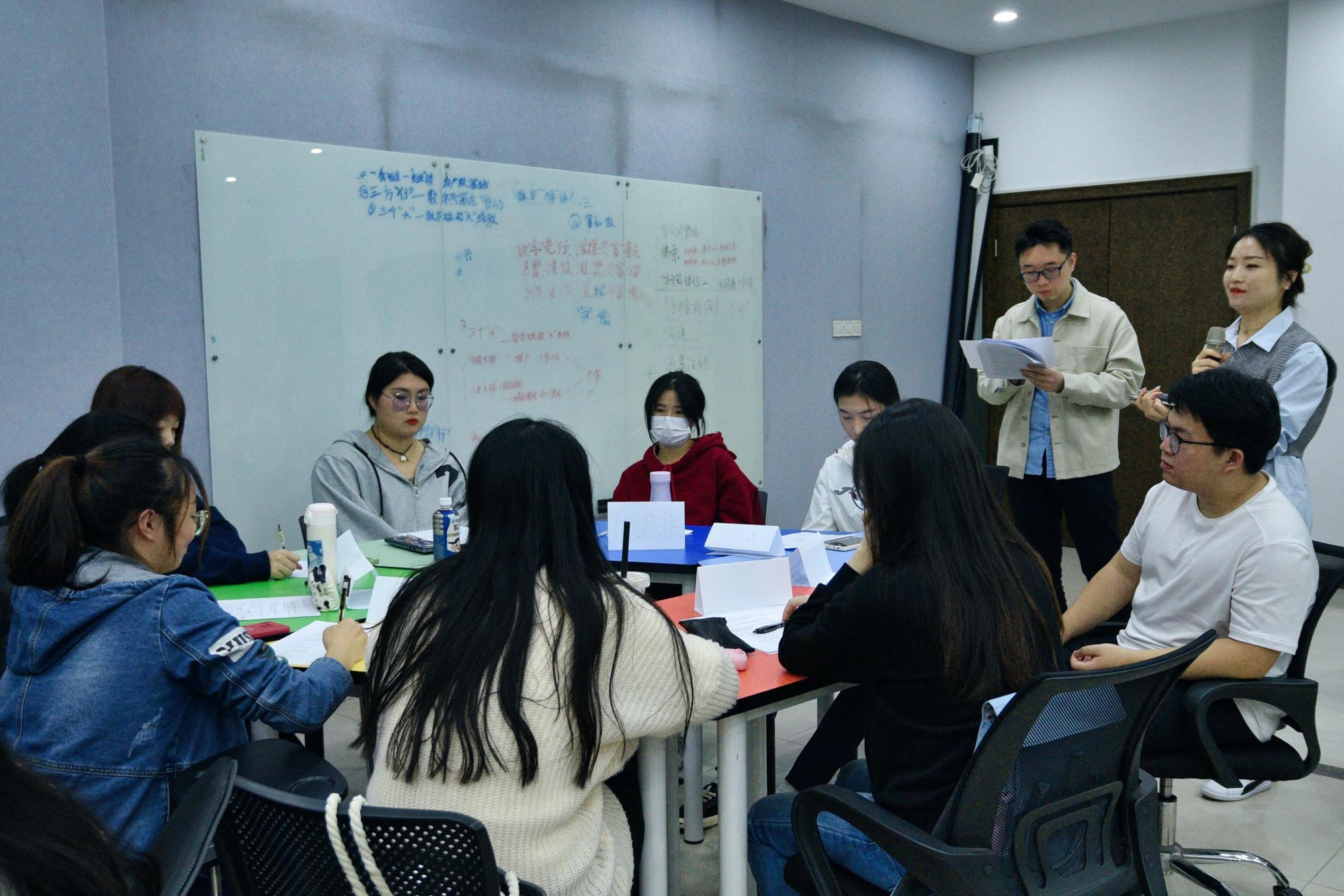 模拟面试环节由学生自我介绍、情景化无领导小组讨论、评委点评三个部分组成。面试过程中面试官从择业目的、职业意向、核心竞争力等方面对面试者进行模拟面试,并结合面试中出现的问题提出了指导性建议。