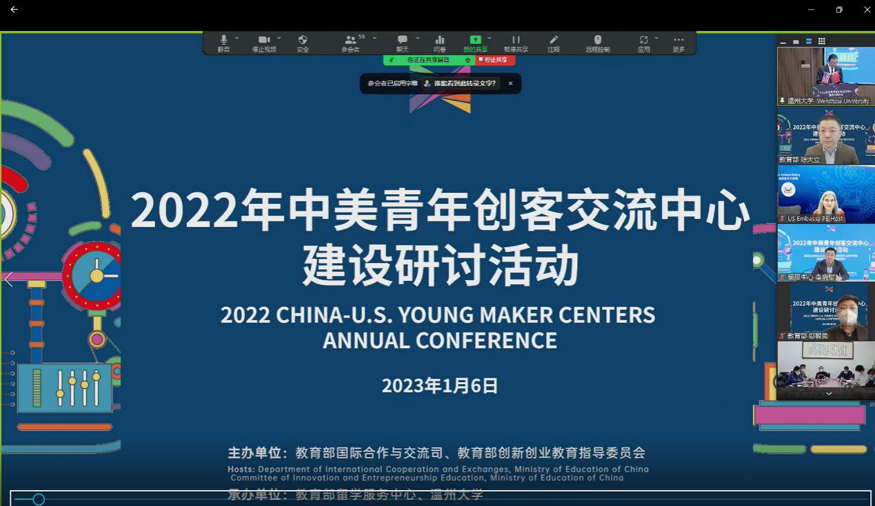 2022年中美青年创客交流中心建设研讨活动于2023年1月上旬举行。活动由教育部国际合作与交流司、教育部创新创业教育指导委员会主办,教育部留学服务中心、温州大学承办,疯av