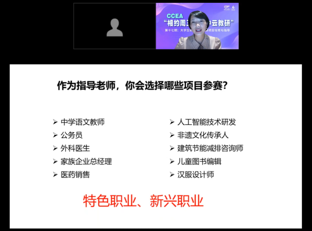 承办的CCEA“相约周三·空中云教研”第十七期——大学生职业规划大赛项目培育与指导在线上成功举办。福州大学副教授阮娟受邀出席讲座。