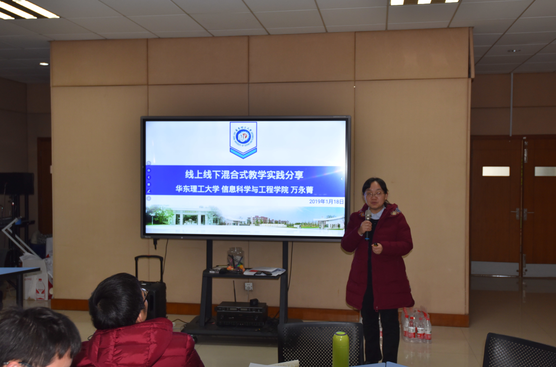 华东理工大学信息科学与工程学院副院长万永菁受邀参与此次《创业基础》研讨会并与在场的课程任课教师们分享了自己线上线下混合式教学实践的经验。万院长主要从在线视频的设计、在线练习的精选、翻转课堂的互动交流、实践提高的实践项目设计四个方面介绍了自己课堂教学的经验,在讲解过程中,万院长还分享了自己的教学箴言:“精心备课是师德师风的体现,立德树人理念支撑起成功课堂”。