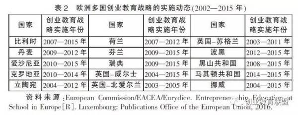 各国政府对创业教育的认知也从单纯的教育或经济的子命题转变为一项复杂的战略性议题。研究报告显示,欧洲许多国家制定了专门的创业教育发展战略并执行多年(如表2),例如芬兰教育部出台《创业教育指导》,荷兰颁布了《创业教育国家行动计划:2007-2012》;挪威教育及研究部联合地方政府和地区发展部、贸易和工业部联合出台《行动计划:创业教育和培训——从基础教育到高等教育》等。截至2015年,在38个受调查的国家和地区中,有29个国家和地区制定了与创业教育相关的战略。其中,有11个国家制定了与创业教育直接相关的战略,其余18个国家制定了与创业教育间接相关的战略。这些创业教育战略不仅涉及教育与培训范畴,也与终身学习战略、青少年发展战略密切关联,与国家创新战略、经济发展改革直接挂钩。