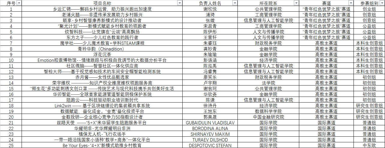 入选复赛项目经过项目训练营及复赛盲审,根据省赛名额,择优选拔20项国内项目进入校赛现场答辩并推荐入围省赛(不含国际赛道),5项国际赛道项目推荐入围省赛,现将具体名单公示如下(排名无先后):